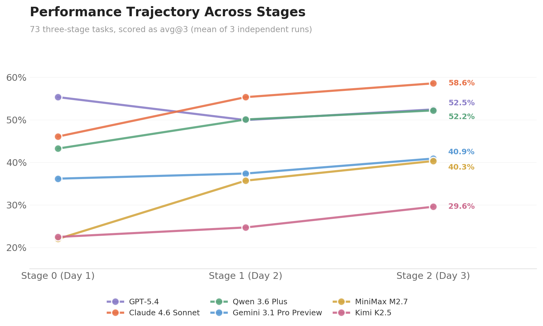 Multi-stage evaluation reveals differentiation that single-stage evaluation cannot. We extracted per-stage avg@3 scores from the 73 three-stage tasks for each model at Stage 0 (day 1), Stage 1 (day 2), and Stage 2 (day 3). At Stage 0, GPT-5.4 (55.3) leads Claude 4.6 Sonnet (46.1) by more than 9 percentage points. But as the environment evolves between stages — new emails arrive, spreadsheets are updated by colleagues, calendar events shift — the gap narrows progressively: down to 5.3 pp at Stage 1, and by Stage 2, Claude 4.6 Sonnet (58.6) overtakes GPT-5.4 (52.5) by 6.1 pp. The two models' overall scores are nearly identical (55.0 vs 54.9), yet this parity masks entirely different scoring structures — GPT-5.4's first-day advantage is offset by the gap in subsequent stages. The score variation across stages reflects how models evolve along the time dimension: as the environment continuously injects new information, models accumulate context, perceive changes, and respond accordingly, with different models exhibiting markedly different adaptation paths — this is precisely the capability dimension that the multi-stage + evolving environment design is built to capture.