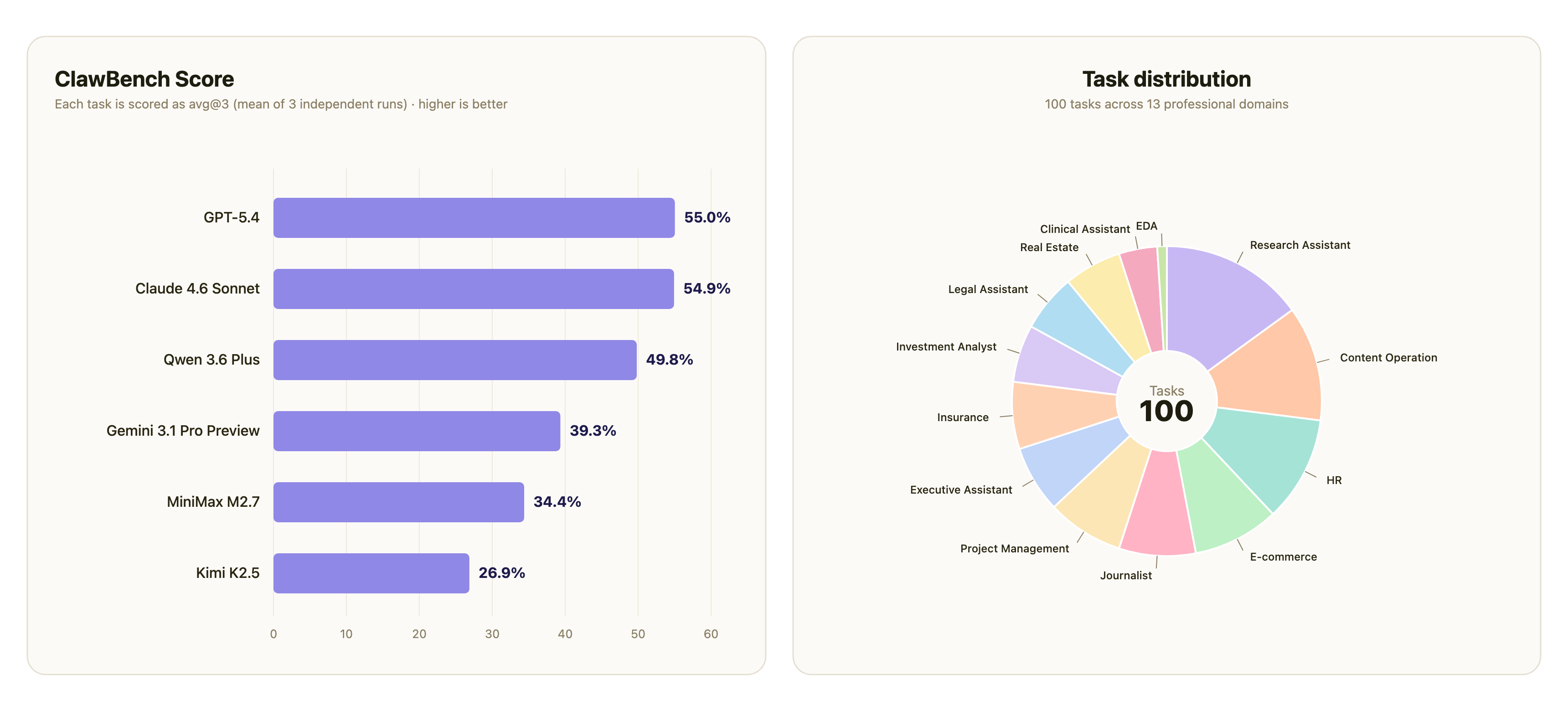 ClawMark is a benchmark for coworker agents — those built to work alongside a human across multiple working days, multiple services, and raw multimodal evidence. It ships with 100 tasks across 13 professional scenarios, a reproducible harness, and fully rule-based scoring (no LLM-as-judge). It is contributed by Evolvent together with 40+ researchers from NUS, HKU, MIT, UW, and UC Berkeley. We evaluated six models across all 100 tasks, three times each. The current leaderboard top is 55.0, and every model shows visible headroom on every scenario.